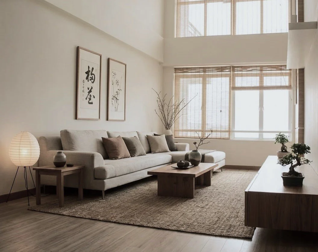 Large framed calligraphy works are placed with deliberate spacing throughout the space, their flowing black ink introducing rhythm and movement against pale, understated walls. Alongside them, scenic photographs of misty mountains and winding forest paths, rendered in monochrome and muted tones, extend the atmosphere of calm, bringing a quiet sense of the outdoors inward.