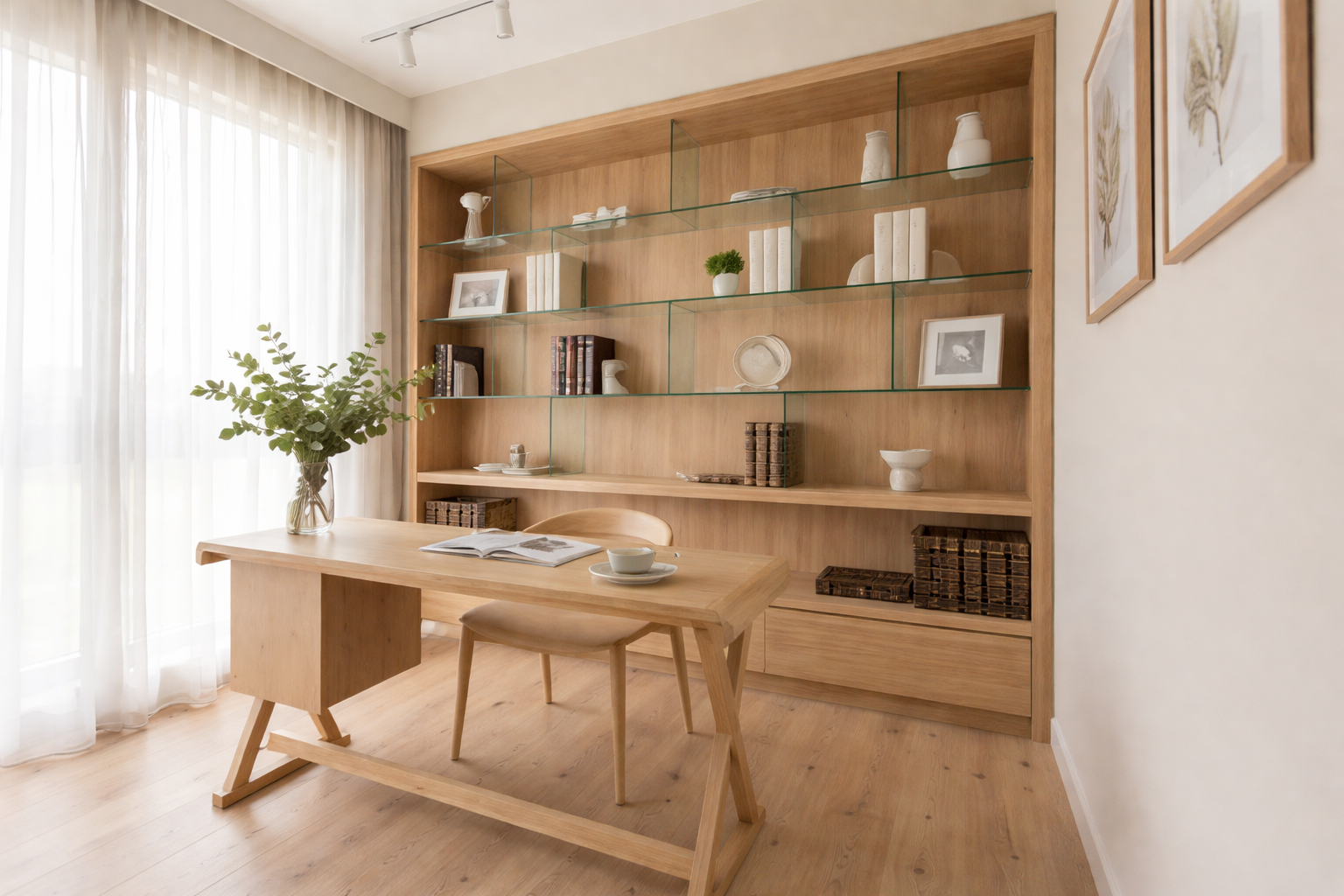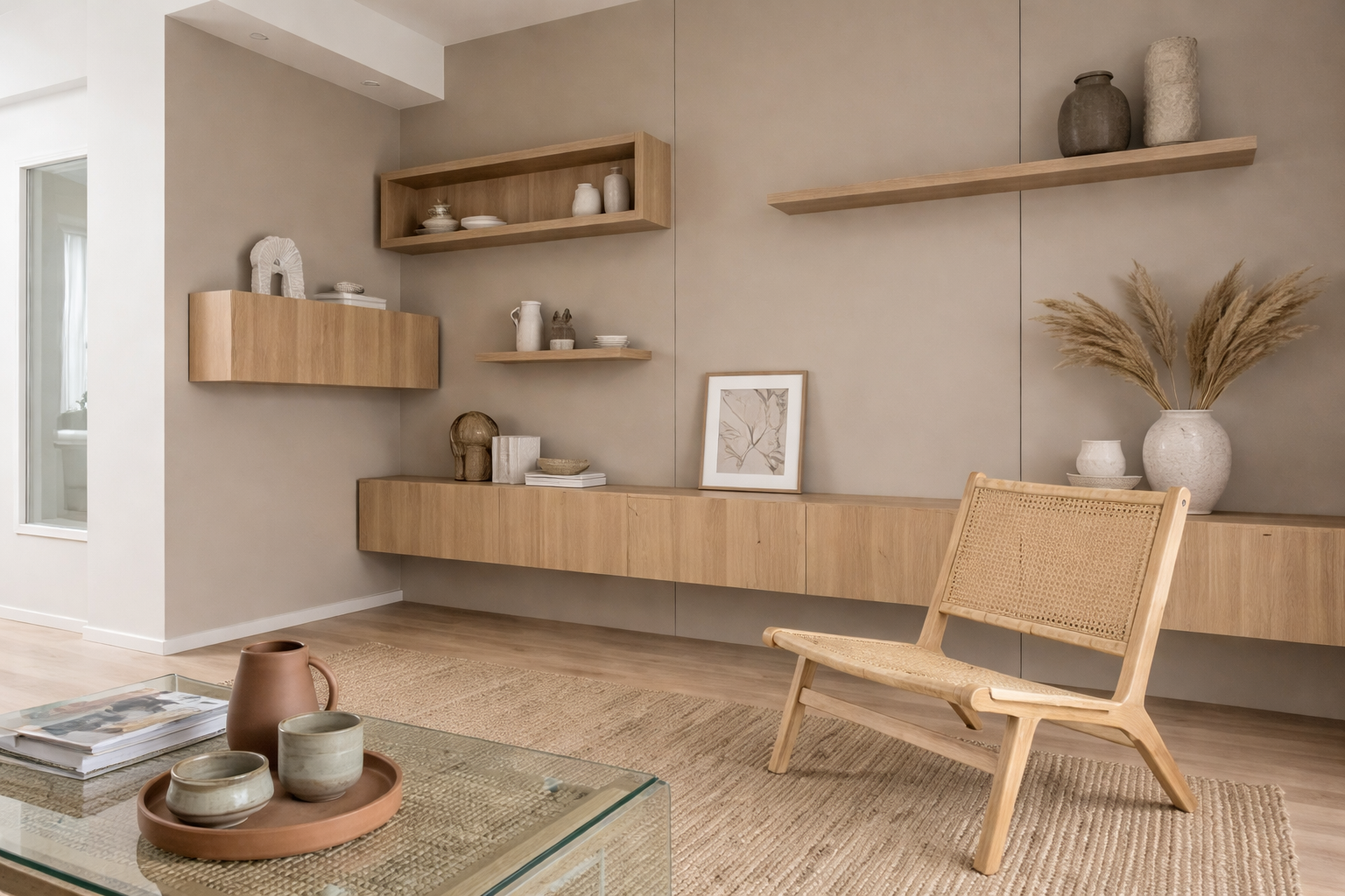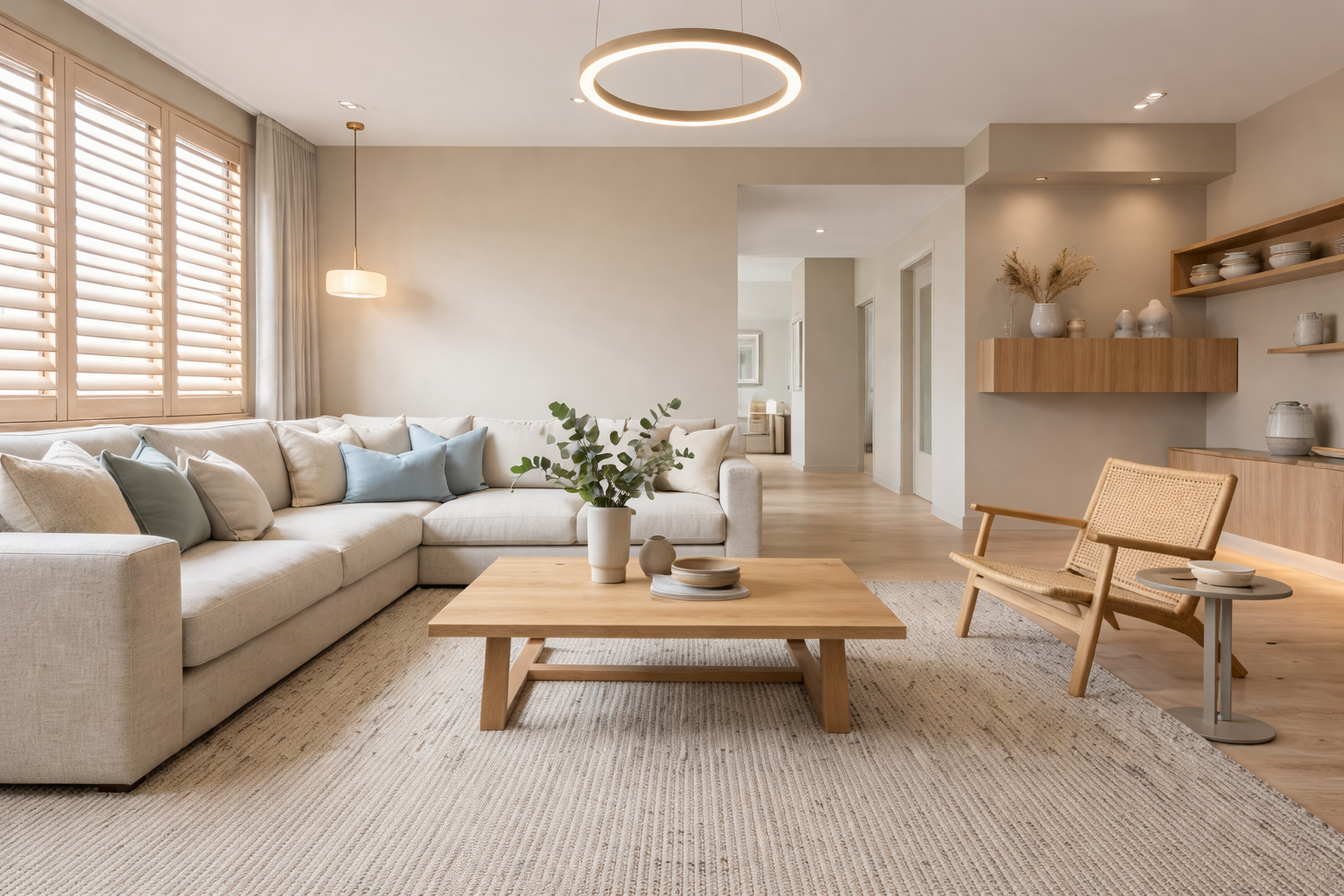 The design is rooted in a clean Japandi language, blending Japanese minimalism with Scandinavian warmth. Natural rattan, timber furniture, and bespoke cabinetry create a soft, tactile continuity throughout the home. Spaces are kept calm and uncluttered, allowing daily family life to unfold naturally.