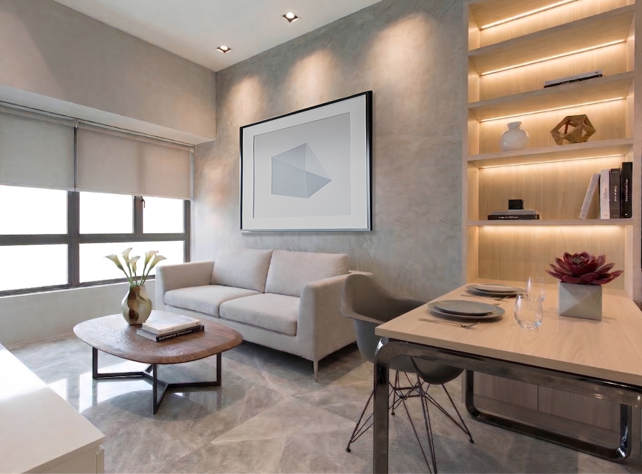 With the limited space, the layout was kept open, allowing the living and dining areas to flow into one another. This helped maximise the space while keeping it easy to move through.