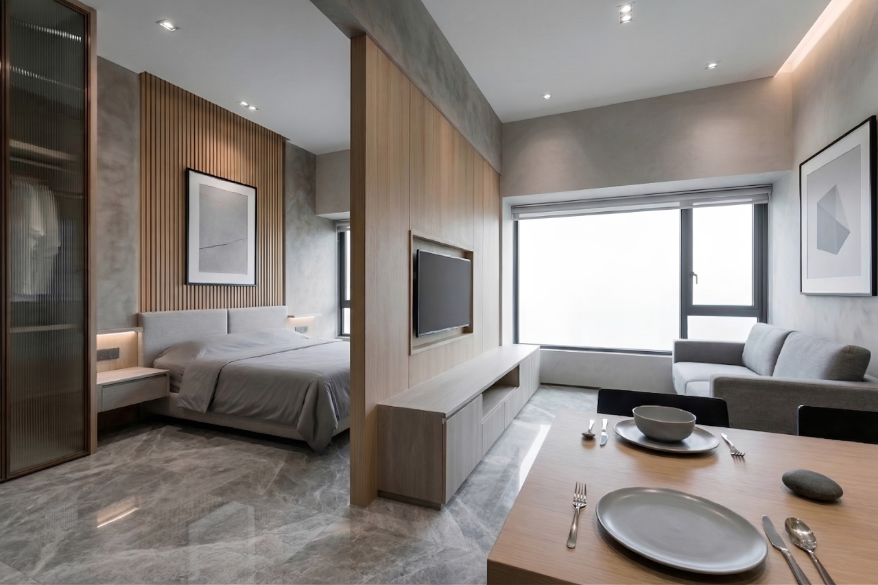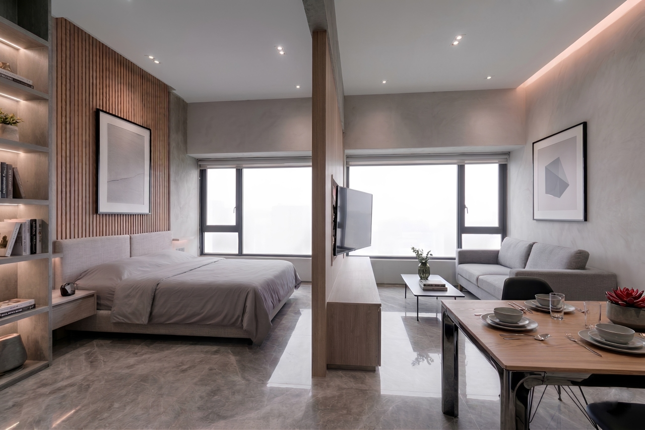 “The material palette was kept restrained—light timber, soft greys, and warm beiges forming a quiet backdrop. It allowed the space to feel calm, composed, and thoughtful, similar to a contemporary hotel suite.”