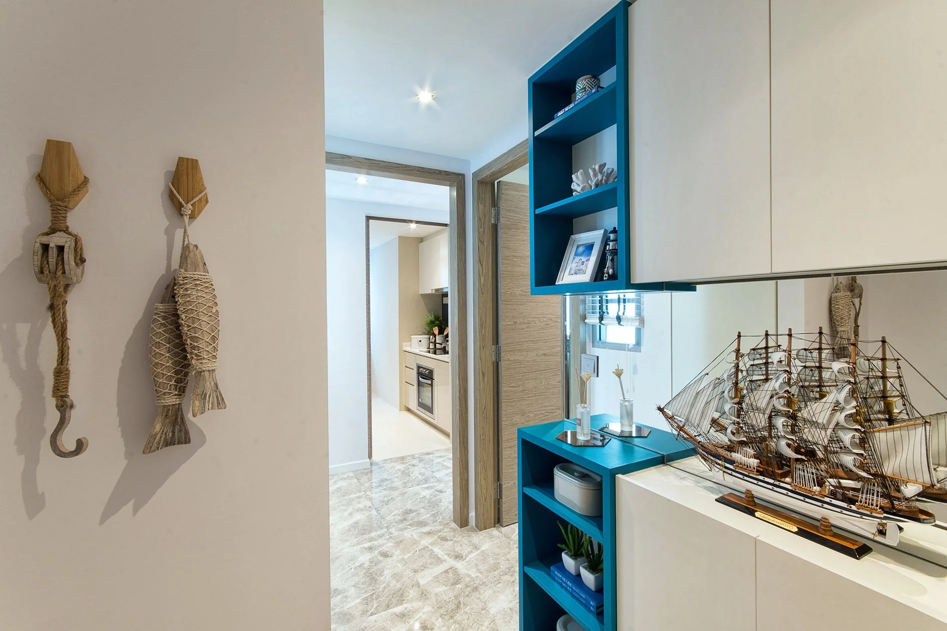 The overall palette of white and blue, paired with subtle nautical references, was kept light and restrained—enough to evoke a breezy, Mediterranean feel without becoming overly thematic.