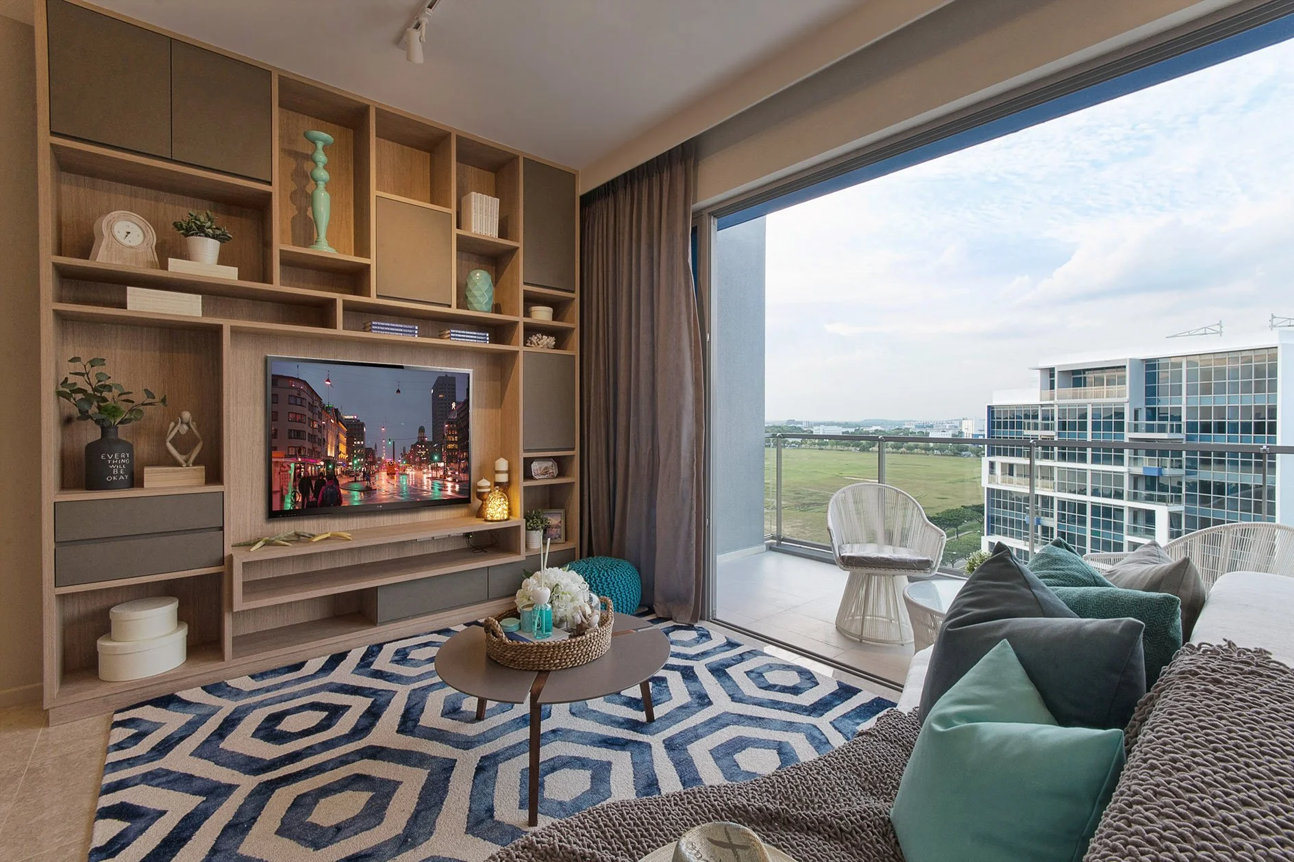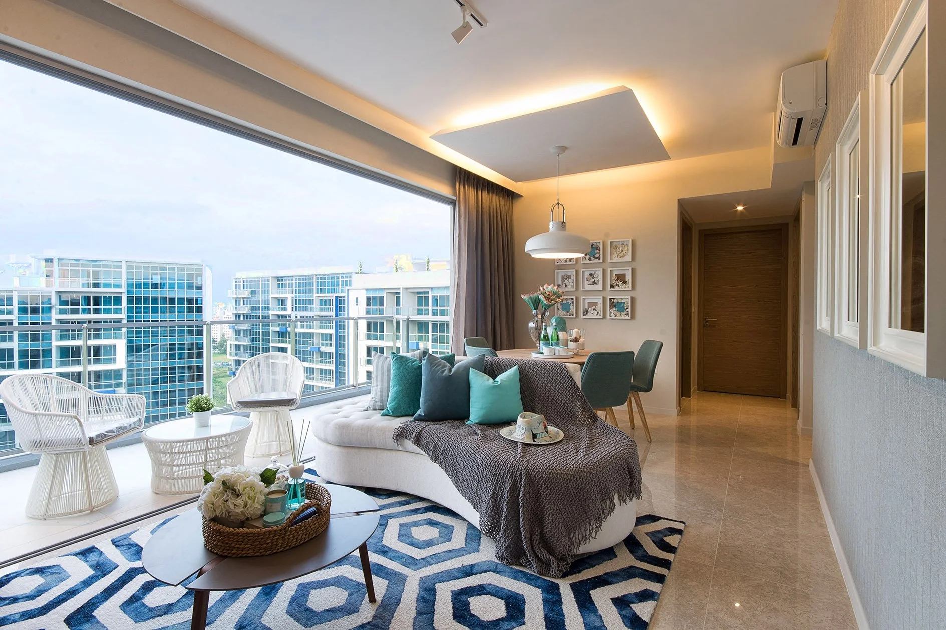 As the layout opens up, the living, dining, and balcony areas flow into one another. Large sliding windows bring in natural light, allowing the space to feel expansive and connected. The consistency in material and colour helps tie everything together in a way that feels calm and cohesive.
